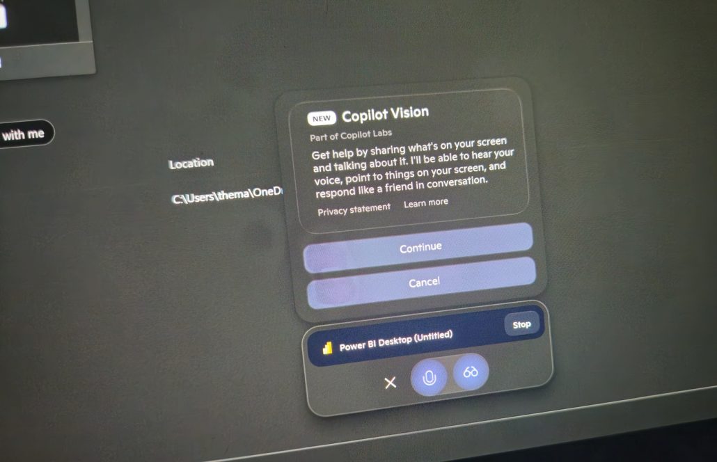 من Power BI را انتخاب کردم و سپس یک پاپآپ یا پنجره کوچک تأییدیه روی صفحه ظاهر شد. من به Copilot Vision اجازه دادم صفحهام را ببیند و بلافاصله بنر زنده به «Power BI Desktop (Untitled)» تغییر کرد؛ یعنی کوپایلوت بهطور فعال محتوای صفحه من، بهویژه Power BI را میبیند.