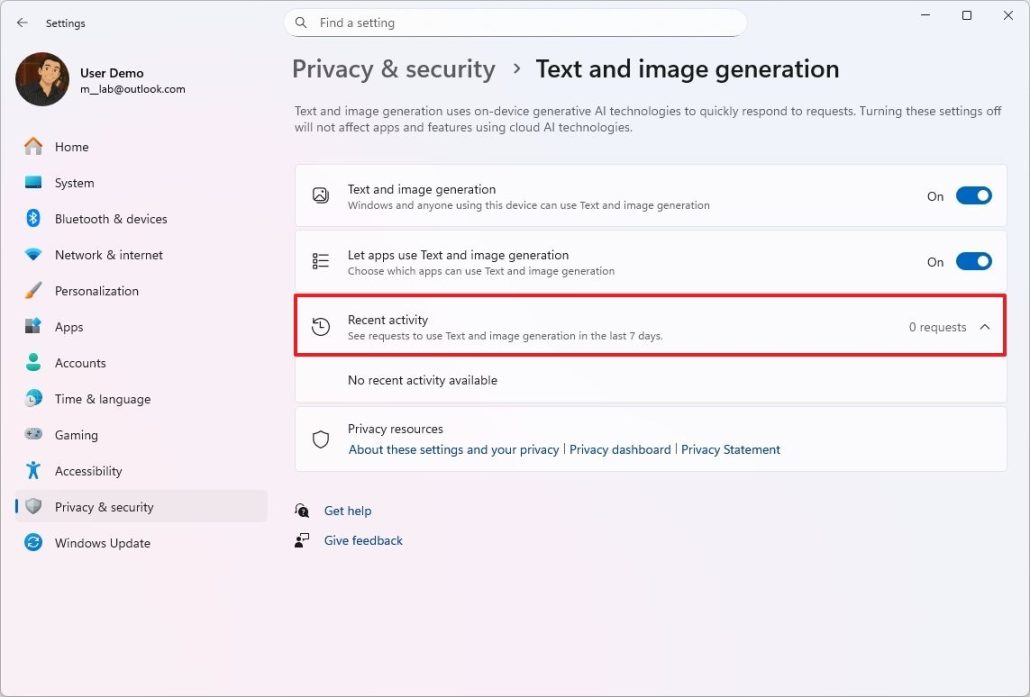 مایکروسافت گزینهای جدید به نام Recent activity اضافه کرده است که درخواستهای اخیر برنامههای شخص ثالث برای استفاده از قابلیت تولید متن و تصویر با هوش مصنوعی را ثبت میکند.
