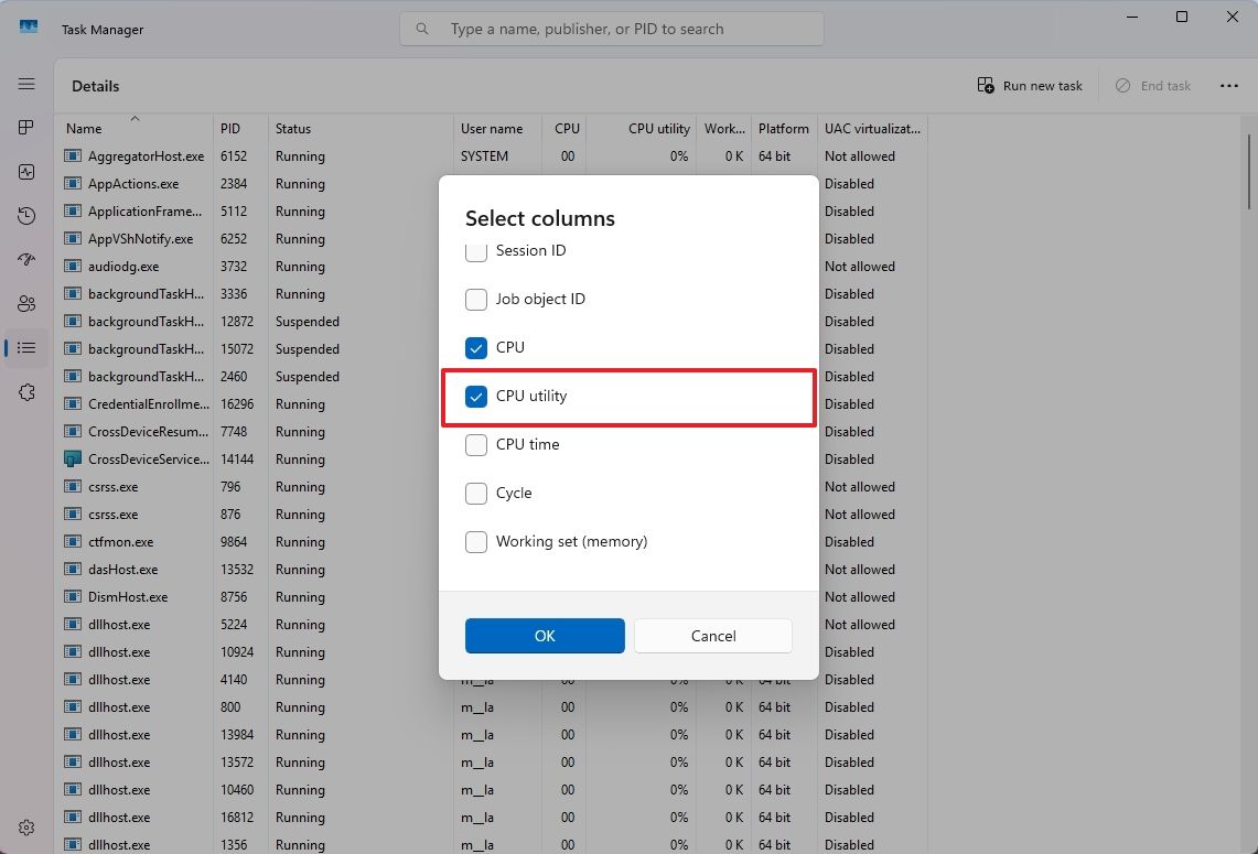 برای مشاهده معیار قدیمی (legacy metric)، به تب “Details” بروید و از منوی زمینه “Select column” گزینه “CPU Utility” را انتخاب کنید.